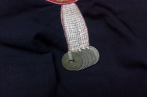 後ろの襟ぐりにコインが吊されていて、