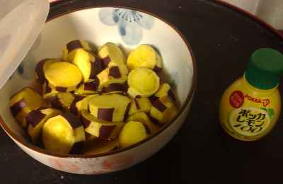 芋(ベニアズマ)、砂糖、ポッカレモン100、醤油ほんの少し器に水と上記材料を入れて、ラップしてレンジでチン!